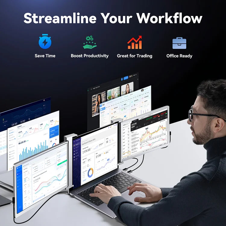 The FOPO S15 is a stylish and portable triple-screen extender that instantly transforms your laptop into a multitasking powerhouse. With two additional 14″ Full HD displays in a sleek grey finish, it provides the flexibility and screen space you need for work, study, gaming, or entertainment—anytime, anywhere.